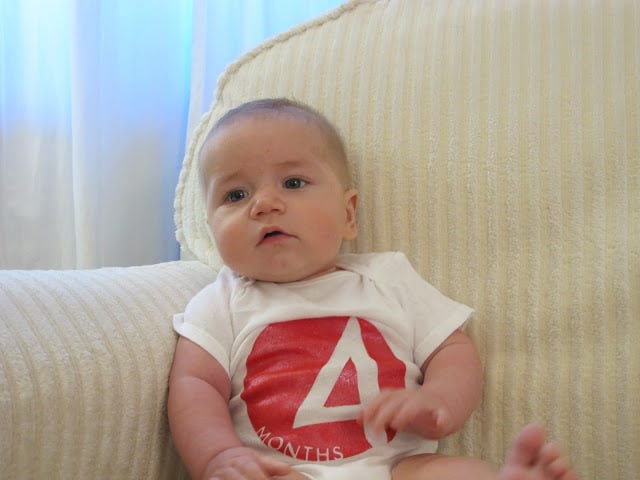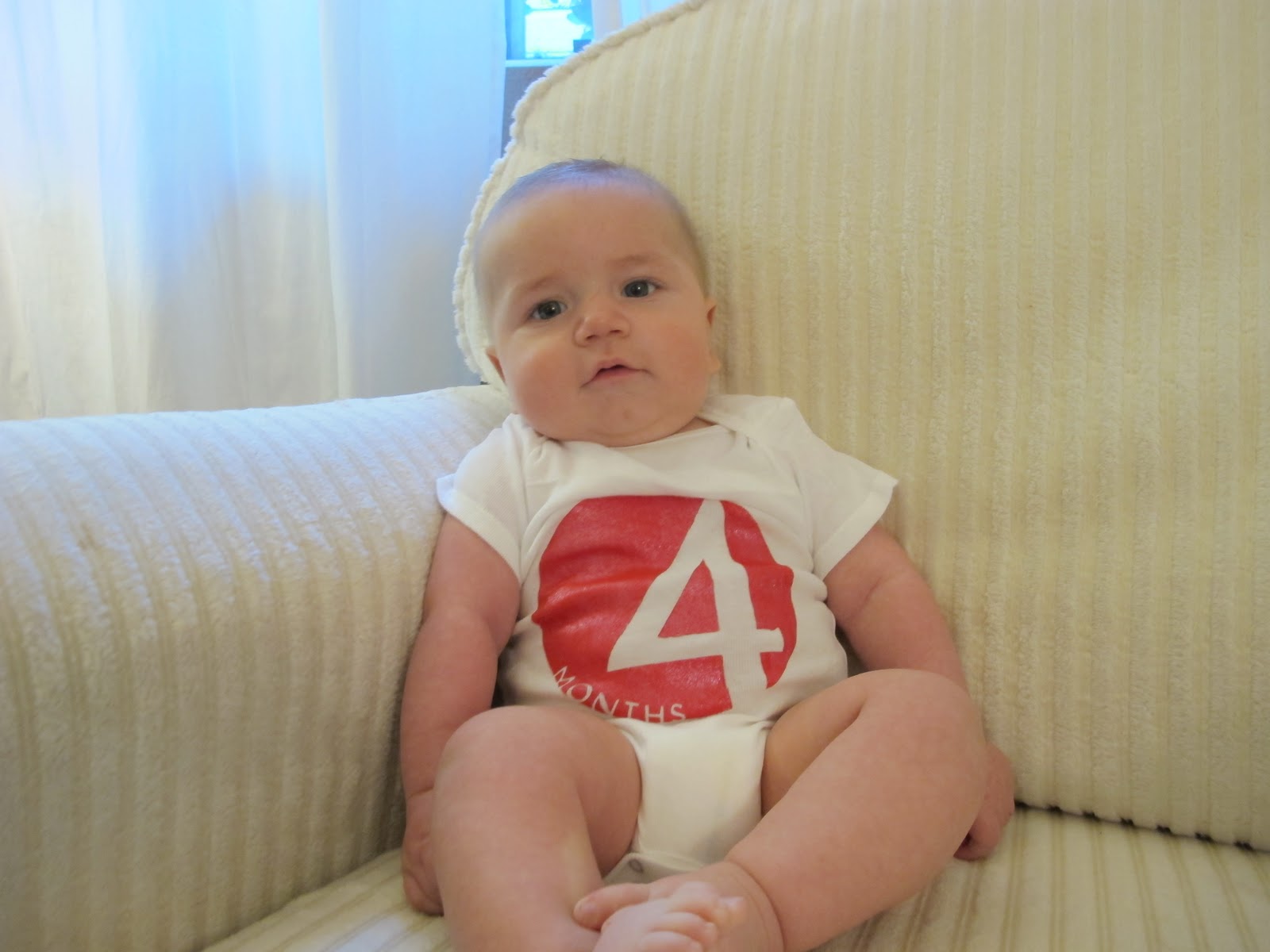 Wow, time is flying by. Today our big boy is 4 months old! I can hardly believe it. This month is a fabulous month. He is starting to babble a lot more and get stronger and stronger. He's definitely holding his head up more and trying really hard to roll over, although it hasn't quite happened yet. Mommy started back at work last week, so he had his first full week at daycare and was having fun. He weighs about 15.5 pounds and loves to smile. This month he celebrated sister's 3rd birthday with her at Disneyland and rang in his first New Year. He also met his Uncle Brian for the first time. To make certain I remember his growth, I'll be taking pictures in the numbered onsies each month for the first 12 months.