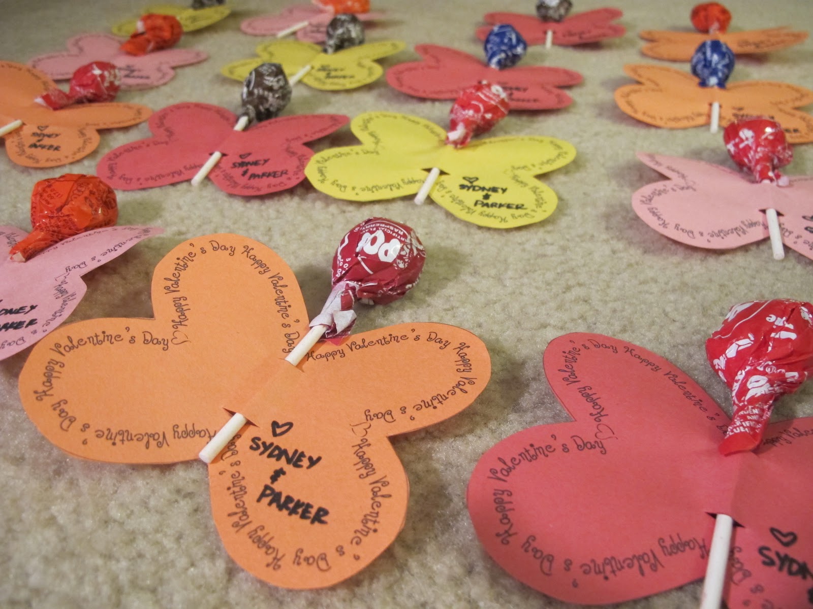 Unfortunately, Diapers-n-Heels Dad and I came down with some food poisoning yesterday and so our Valentines making skills were far less embellished than originally planned. In any case, I found these super cute printable Valentines from Skip to my Lou. Some card stock, a few lollipops and we are on our way!