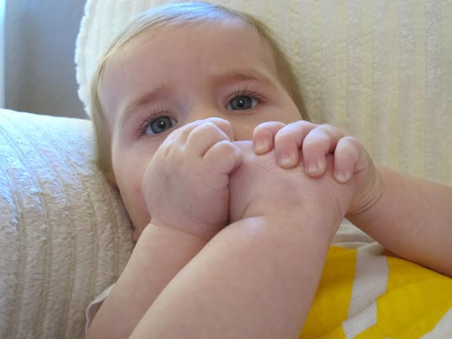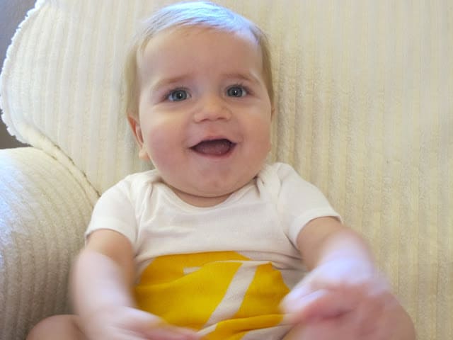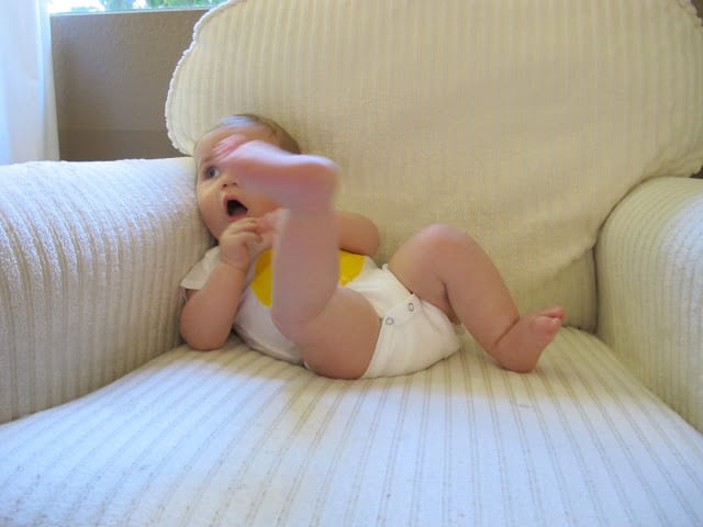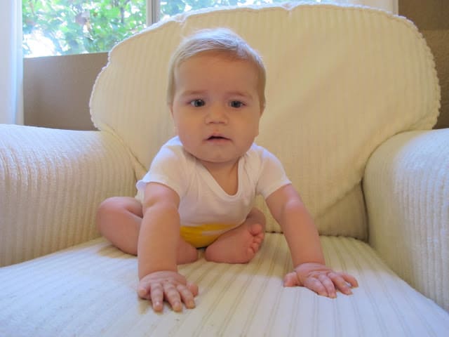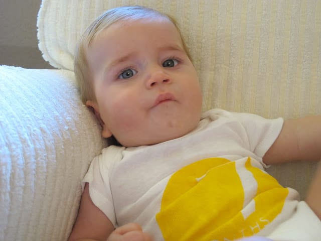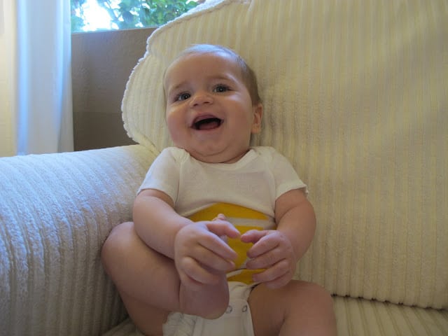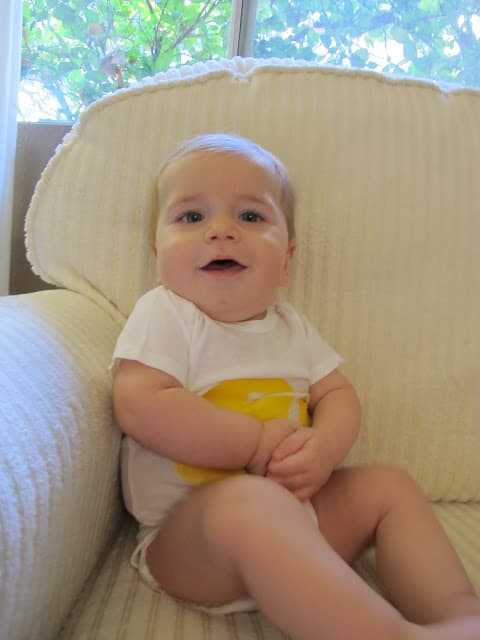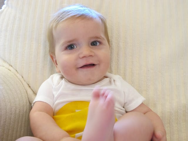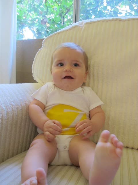Today marks seven months old! My sweet handsome boy has grown a ton this month. He's super chatty these days and moving and shaking all the time. This month he not only mastered rolling from his front to his back, but he's also rolled from his back to his front. He's not super great at sitting up on his own because he ends up reaching out in front of himself and eventually ends up on his tummy. Crazy boy! He's still the most awesome sleeper I've ever seen. We put him down and without a peep, he is asleep and sleeps till the next morning. I'm counting my blessings because I'm sure it will change soon enough, but we'll take it while we can!